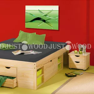 Двуспальная кровать "Лето" из массива дерева. Стандартные размеры кровати по матрасу: 140х190, 160х200, 180х200. Основание под матрас - деревянные лаги. Двухспальная кровать "Лето" оснащена ящиками и полочками для хранения вещей. Дополнительно можно заказать прикроватные тумбы.